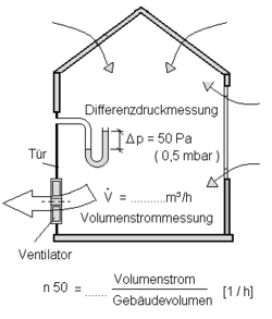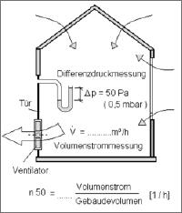 - Stündliche Luftwechselrate (V50 / V Raum = n50) bei 50 Pa zu messen